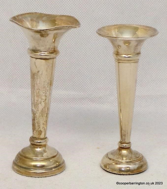 QEII Sterling Silver Bud Vases. Hallmarked Birmingham 1975. Height 10.5 & 9.5 cm. (2 Items)