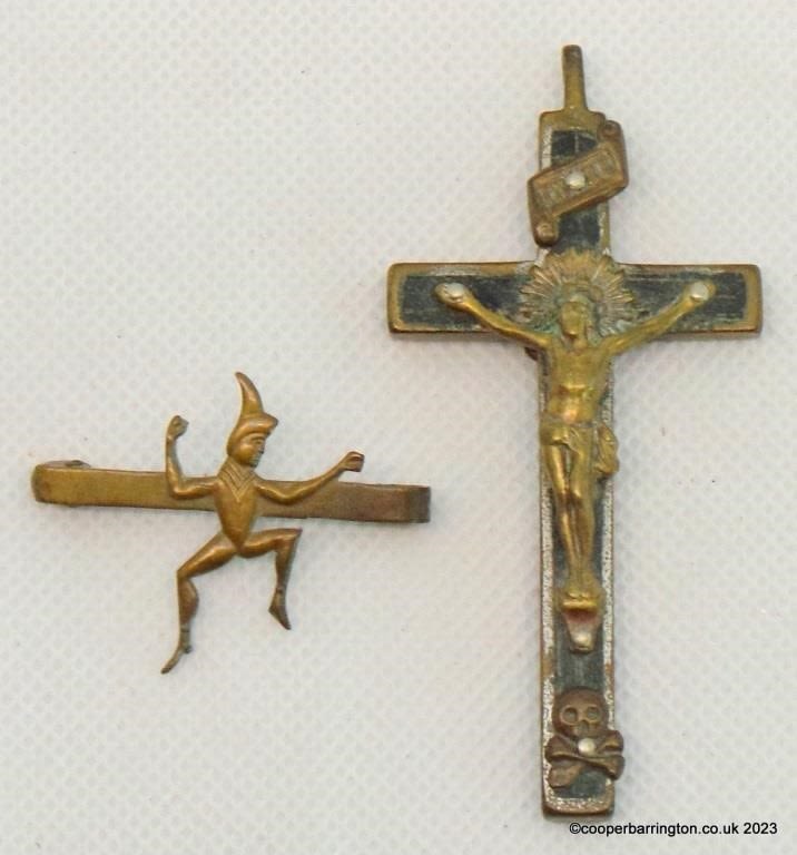 Religious Antique French Catholic Wood/Brass Crucifix Pendant Cross Holy Jesus Christ with Skull and Bones. Early 1900s. Also scarce antique early Girl Guides Bar Brooch. (2 Items)