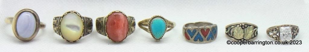 Collection of Seven Silver Rings to Include: CZ. Turquoise. Enamel. Moonstone Etc. 39.7 gm gross. (7 Items)