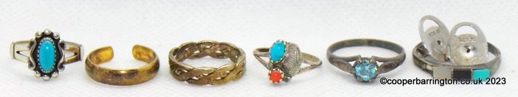 Collection of Seven Silver Rings to Include: Turquoise. Mother of Pearl. Etc. 12.5 gm gross. (7 Items)