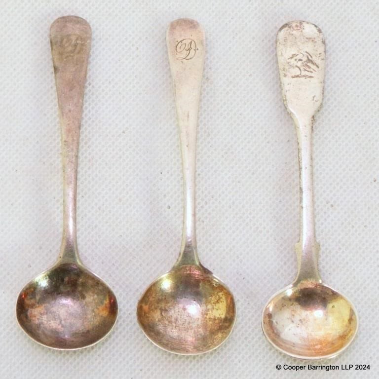 A Pair of George III Sterling Silver Sauce Spoons by Thomas James. Hallmarked London 1809. Monogrammed D. Also one other by Joseph Mayer. Hallmarked Exeter 1863. Swan Armorial. (3 Items)