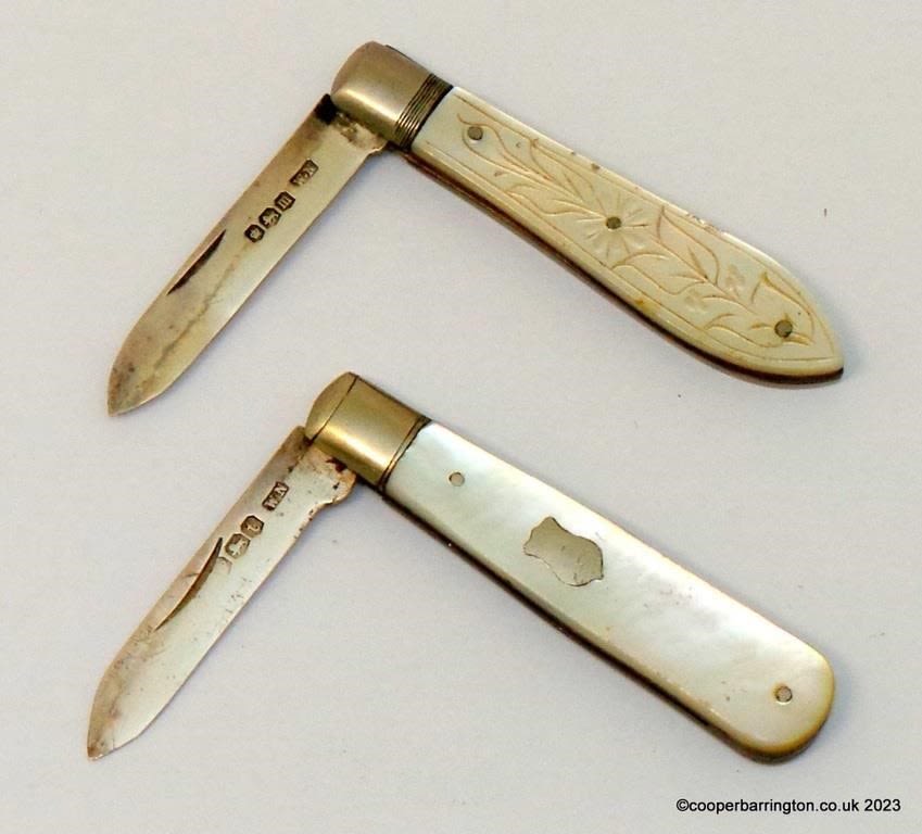 KGV/KGVl Sterling Silver Mounted Mother of Pearl Fruit Knives by William Needham. Hallmarked Sheffield 1929/1936. (2 items)