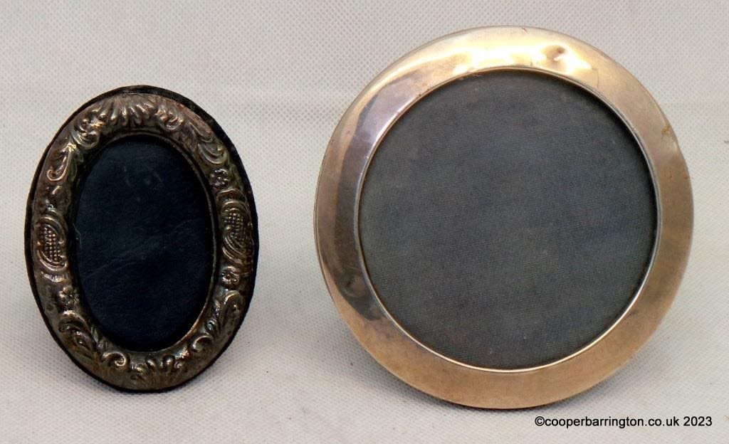 Edwardian Sterling Silver Easel Circular Photograph Frame by Boots Pure Drug Company. Hallmarked Birmingham 1909. Diameter 10 cm. Also a QEII Sterling Silver Repousse Oval Photograph Frame by Keyford Frames Ltd. Hallmarked London 1991. (2 Items)