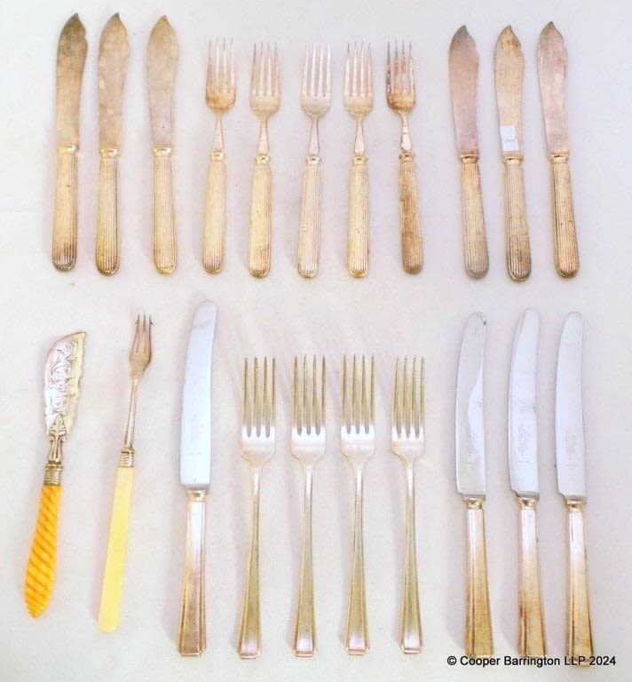 Elkington & Co Silver Plated Fish Knives & Forks with Registration Marks for 28th March 1872. Plus Silver Plated Pickle Fork. Butter Spreader. Hiram Wild Knives and Forks. (21 Items)