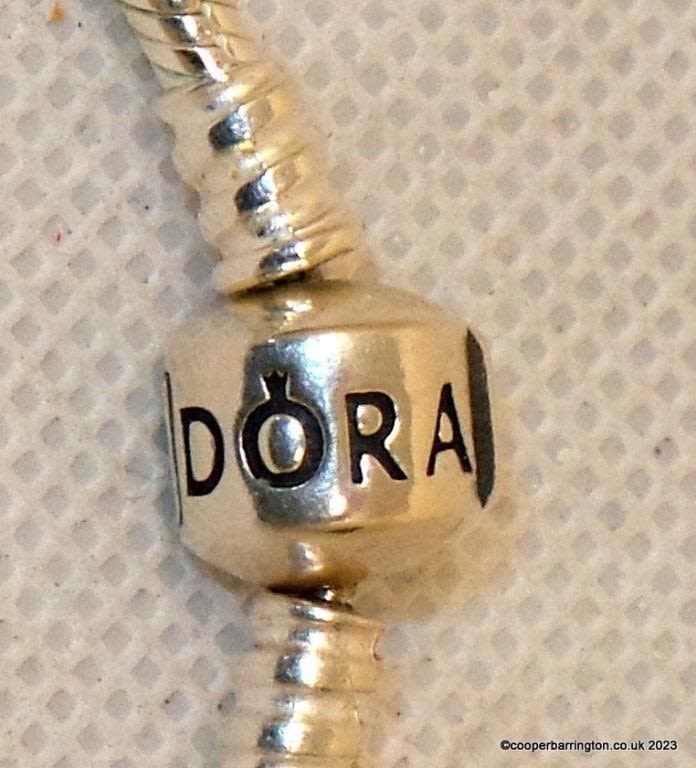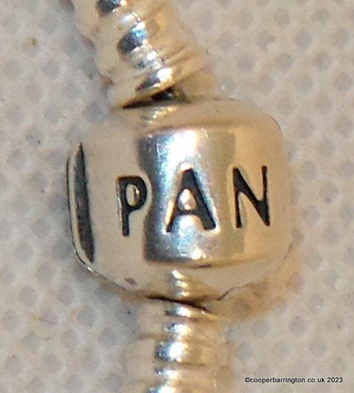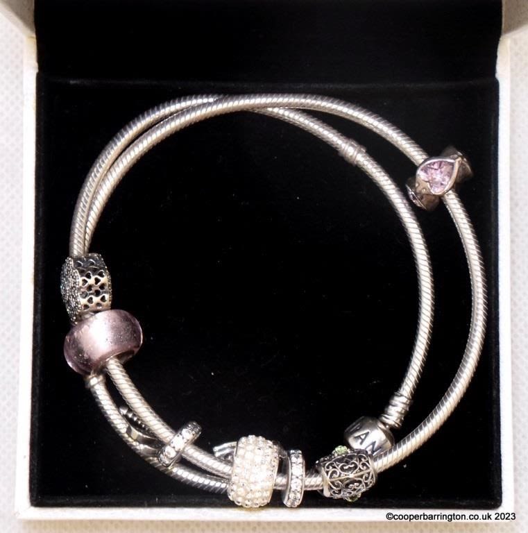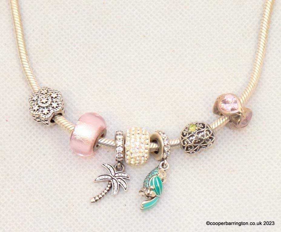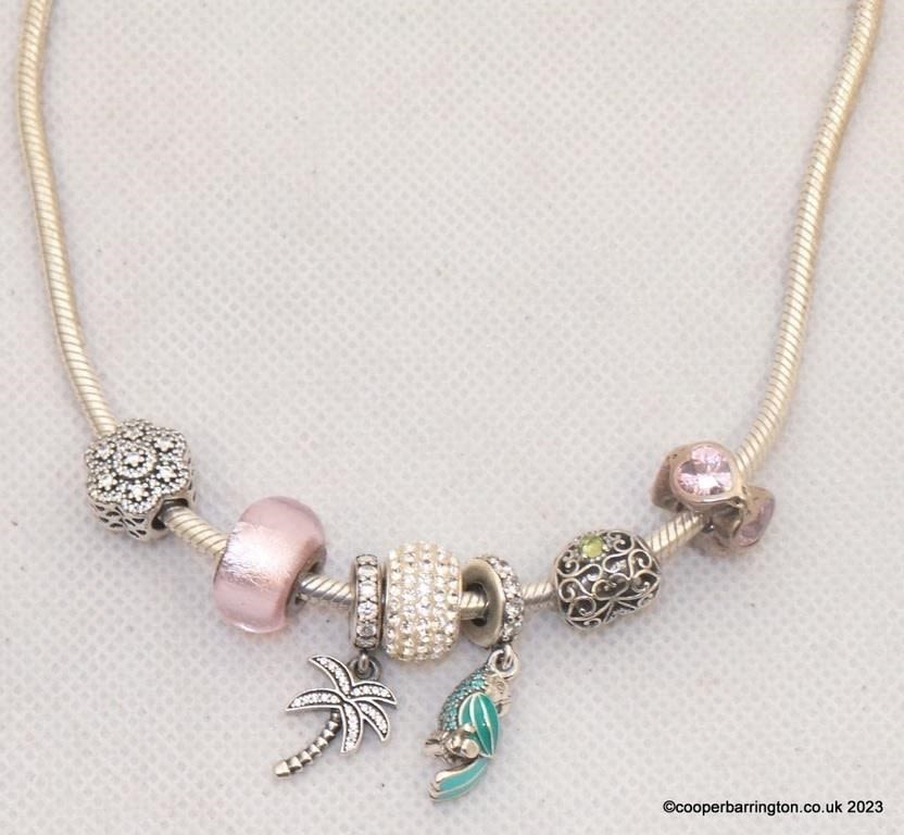 Boxed Pandora Moments Snake Chain Necklace,S925 Sterling Silver and 7 Silver Charms. Length 17.5 inches.