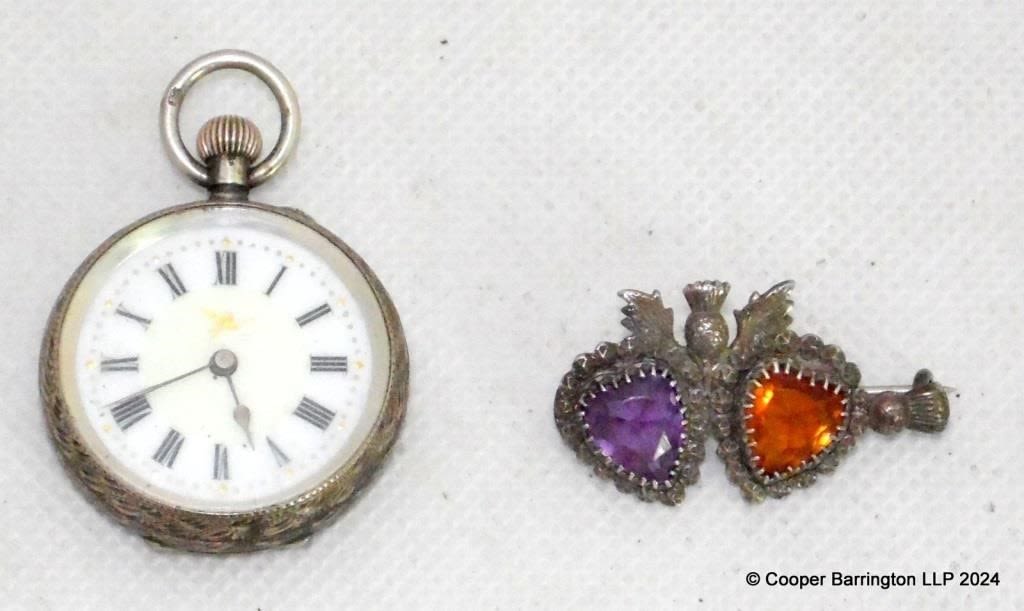 Antique Charles Horner Sterling Silver Amethyst and Citrine Hearts Thistle Brooch. Hallmarked Chester. Also a Lady’s .935 Swiss Silver Pocket Watch. (2 Items)
