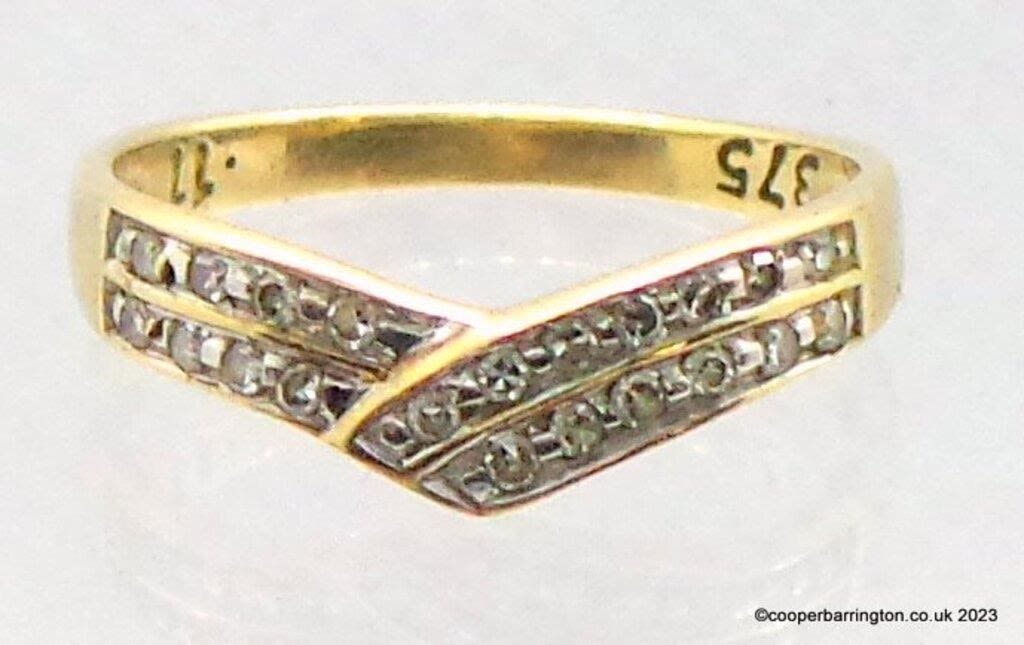 9ct Yellow Gold and Diamond Wishbone Ring. Marked .375. Size H (7). 1.1 gm gross.