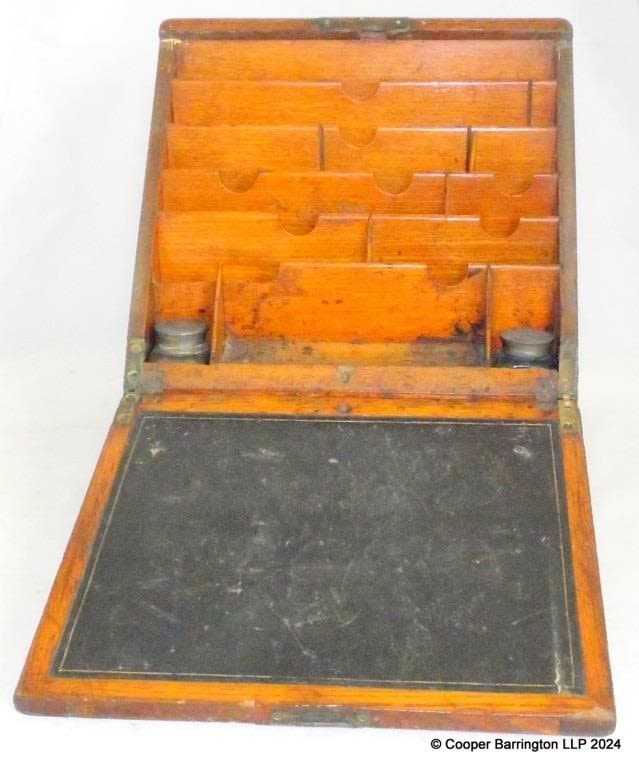 Victorian Oak Stationary Letter Box. 19th Century. The fall front with inset leather opens to reveal two inkwells,pen tray and pigeon holes all over a single drawer. Height 31 cm. Width 33 cm. Depth 20 cm.