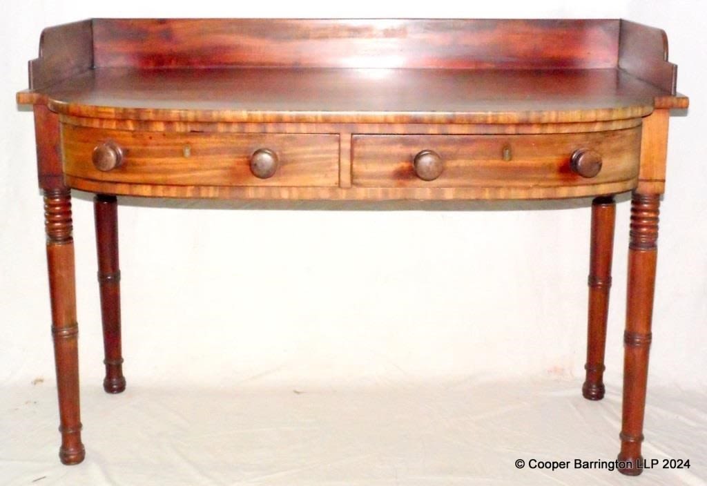 Regency Mahogany Serving Table. Early 19th Century. The shaped upstand back on the D shaped top over two drawers all raised on turned legs. Height 32 in. Width 45.25 in. Depth 23 in.