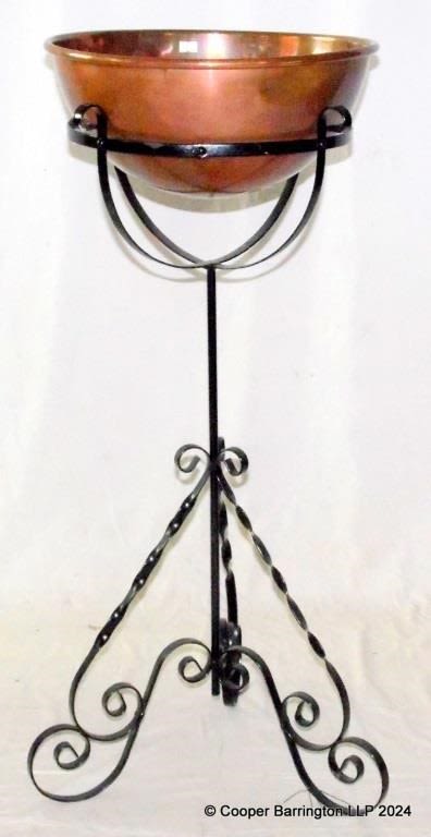 Tall Wrought Iron & Copper Art Nouveau Planter. Early 1900s. The copper planter stands on a shapely tripod base with twists and scrolls. Height 35 in.