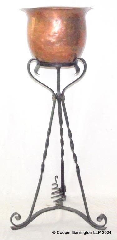Tall Wrought Iron & Copper Art Nouveau Planter. Early 1900s. The copper planter stands on a shapely tripod base with twists and scrolls. Height 39 in.