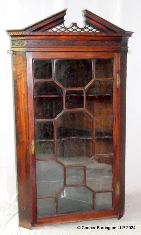 Georgian Chippendale Style Mahogany Astral Glazed Corner Cabinet. 18th Century. The broken arched fretted pediment over a carved freeze and astral glazed door on brass H hinges opening to reveal three shaped shelves. Height 51 in. Width 30 in. Depth 18 in.