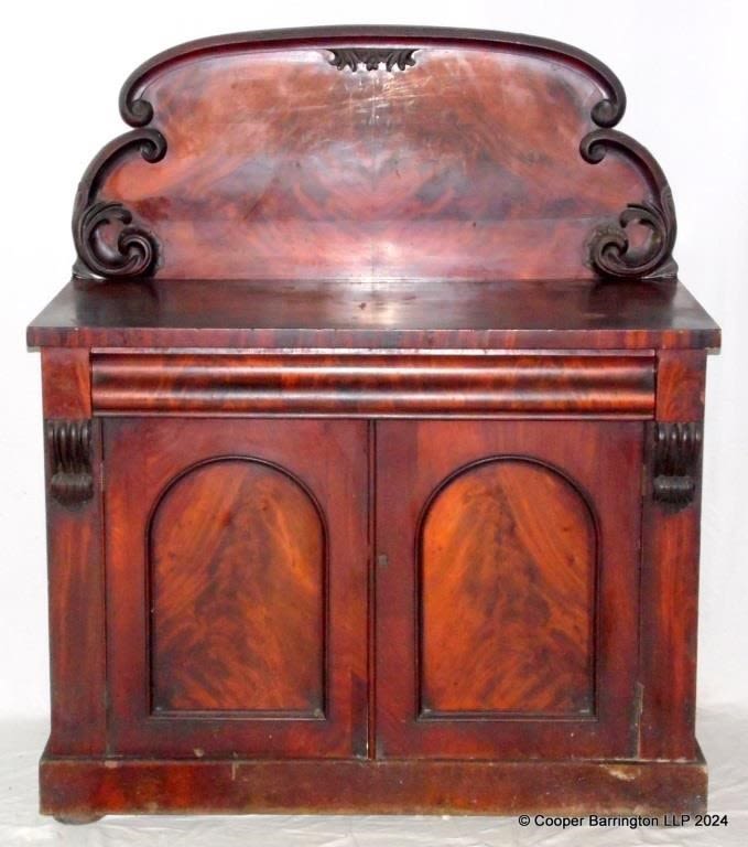 Victorian Mahogany Two Door Chiffonier. 19th Century. Having carved and bookleaf veneer upstand back over a single drawer and a double cupboard all raised on a plinth base. Height 55 in. Width 46.25 in. Depth 21.5 in.