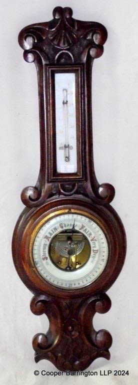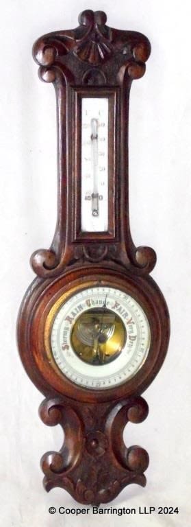 Antique Edwardian Quality Carved Oak Aneroid Banjo Barometer. Length 58 cm.