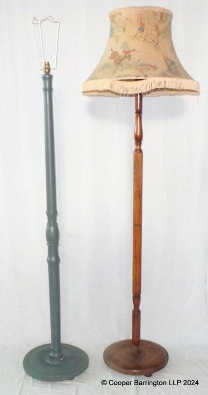 1920s/30s Mahogany Standard Lamp & Shade. Working order. Height 69 in. Plus one other Painted in Georgian Green. Will need rewiring by a qualified electrician. Height 68 in. (2 Items)