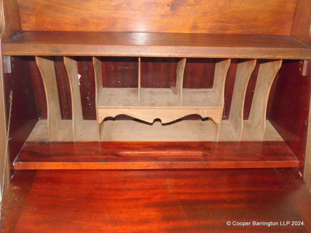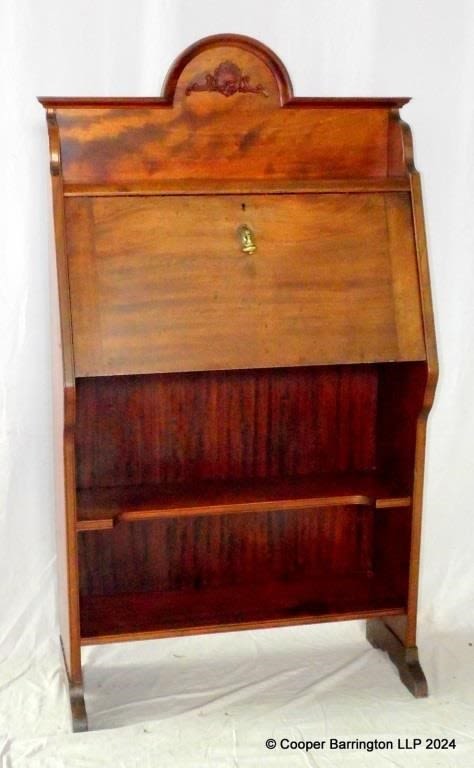 Antique Narrow Mahogany Bureau Bookcase/Secretary Desk. Early 1900s. Having fall front writing surface revealing a fitted interiour over bookshelves. Height 50 in. Width 28.75 in. Depth 18 in.