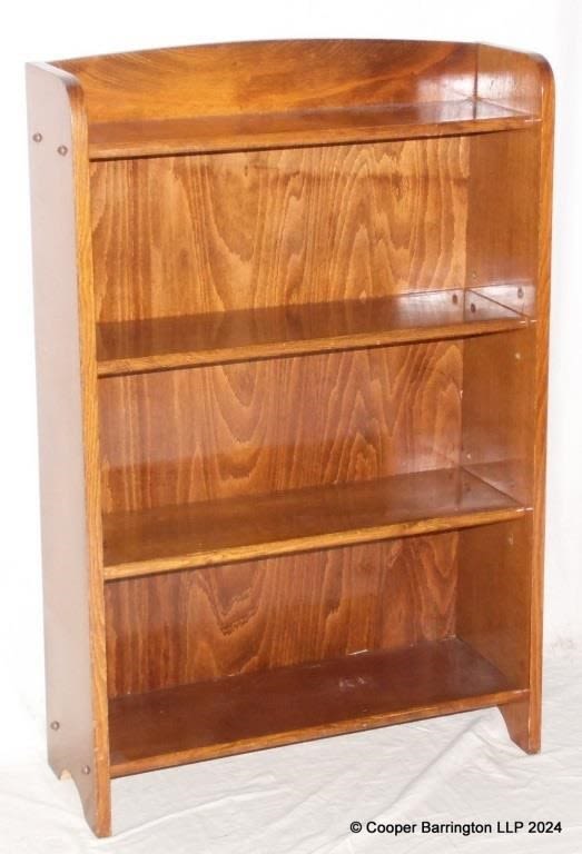Vintage Honey Oak Waterfall Four Shelf Bookcase. Height 37 in. Width 24 in. Depth 8.5 in.