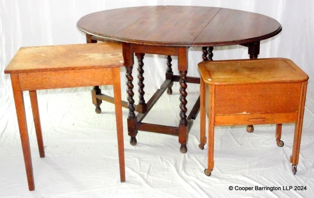 1920s Barley Twist Honey Oak Gate Leg Table. Also an oak needlework box and a lamp table. (3 items)