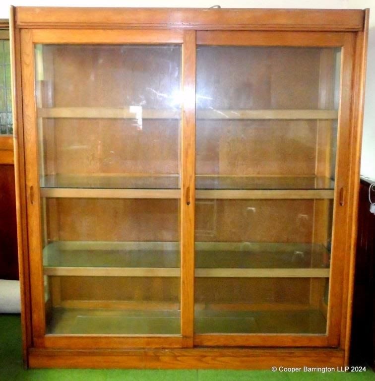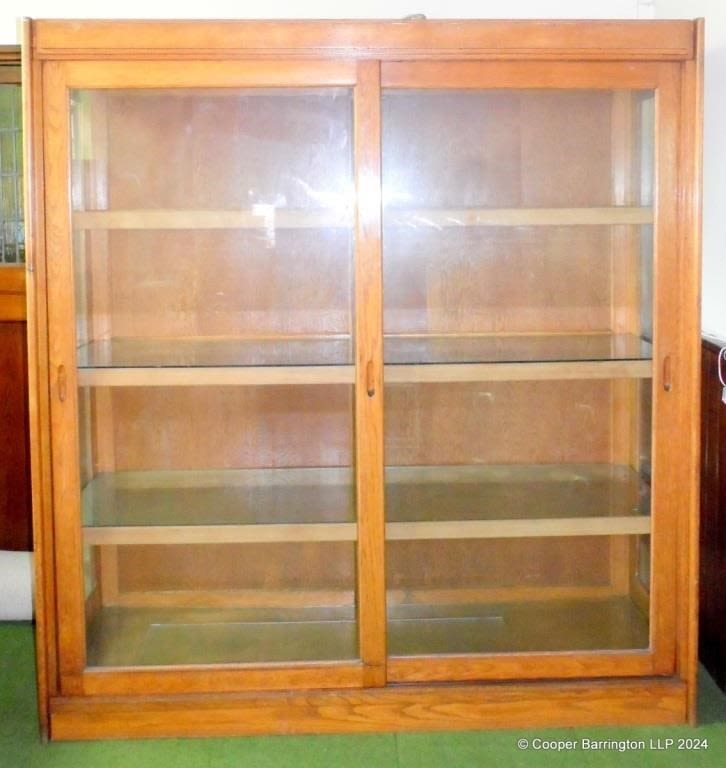 Large Shop Oak Glass Display Case with Sliding Doors and Glass Shelves. Height 78 in. Width 71 in. Depth 22 in.