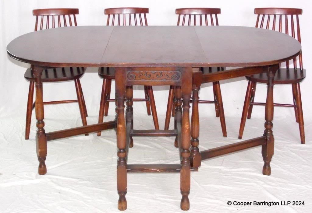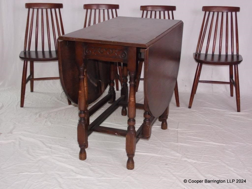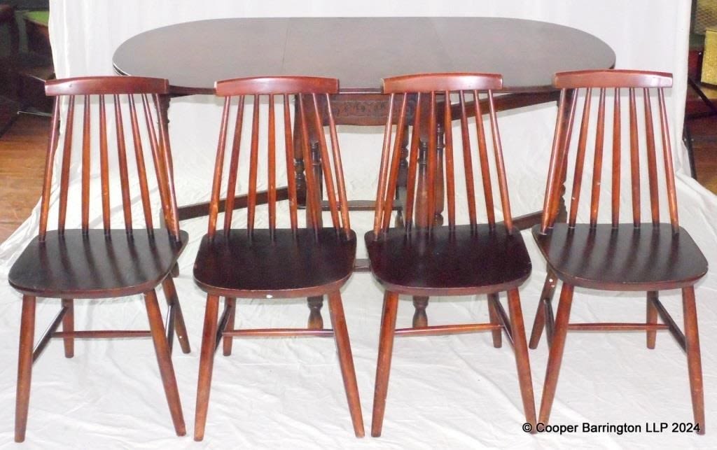 Vintage Set of Four Ikea Tellus Dining Chairs. Circa 1966-78. Height 32 in. Also an oak dropleaf table. Height 30 in. Width 36 in. Length 20 – 58.5 in. (5 items)