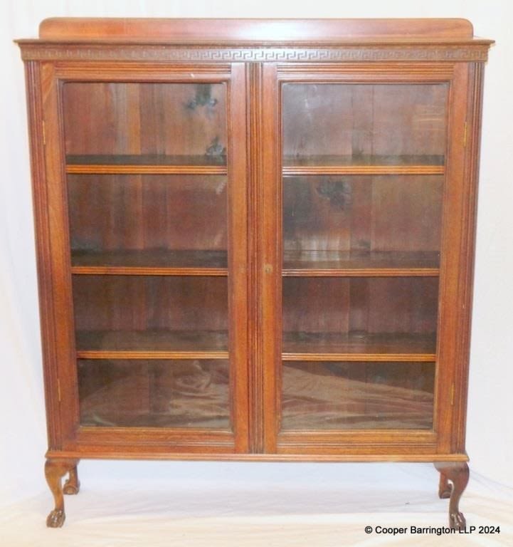 Edwardian Mahogany Dwarf Bookcase. Early 1900. The top with upstand over two glazed doors opening to reveal six adjustable shelves raised on short cabriolet legs. Height 59 in. Width 49.5 in. Depth 11 in.