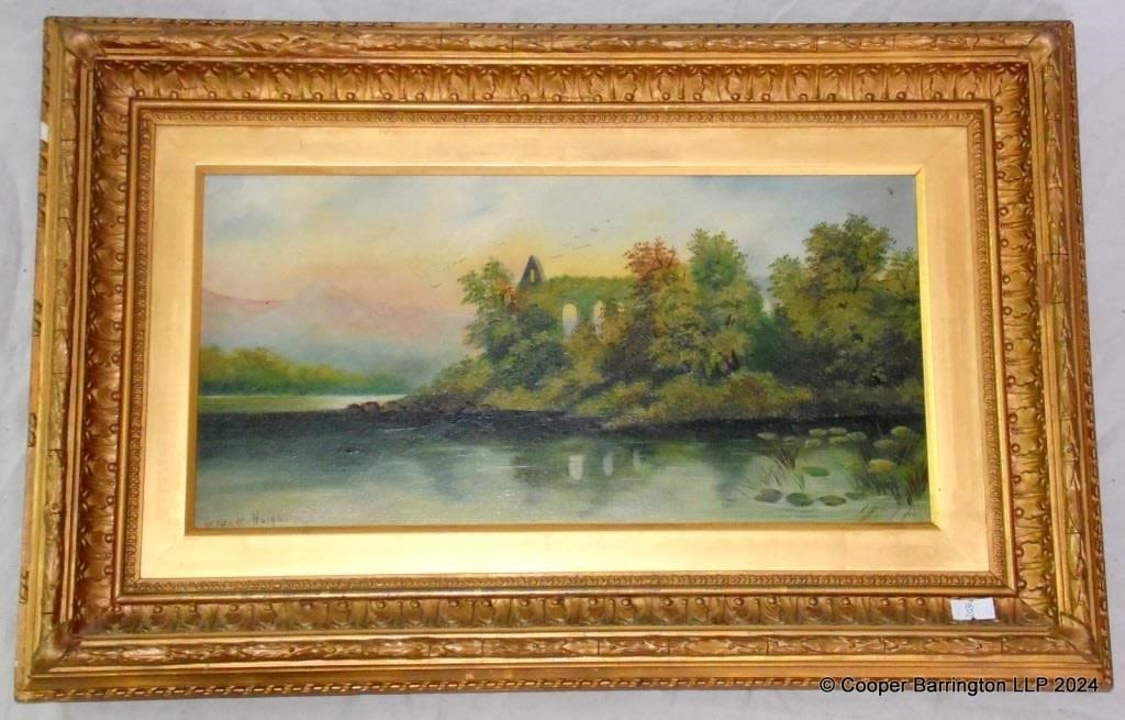 Gertrude Haigh Oil Painting on Canvass ‘Bolton Abbey’ Landscape. Circa 1892. Signed Gertrude Haigh lower left,title to verso. Gilt framed 57 x 37 cm.