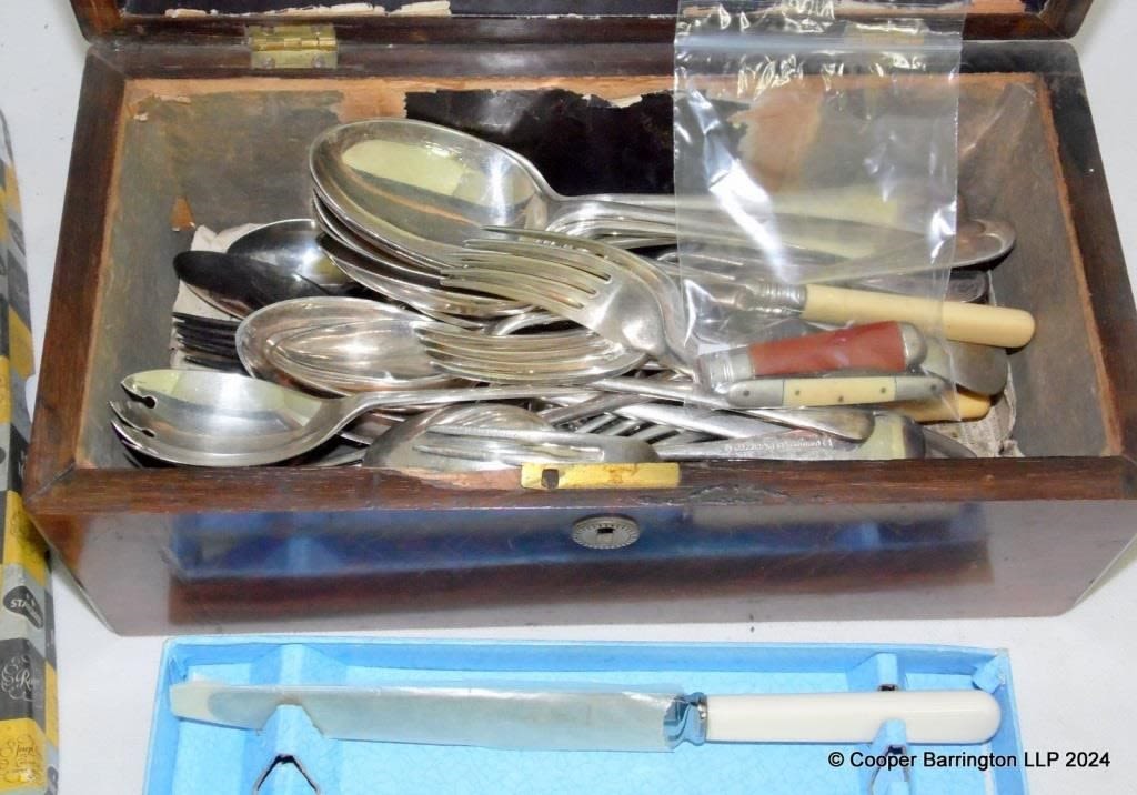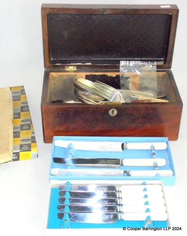 Victorian Flame Mahogany Box with an Assortment of Silverplated Flatware. Also two penknives.