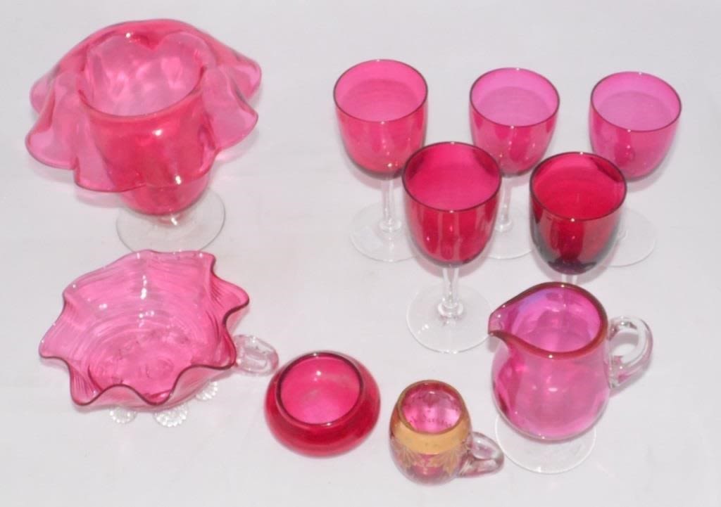 19th Century Victorian Cranberry Glass to Include: 5 x Wine Glasses. Milk Jug. Basket with Ruffled Rim on Crimped Feet. Salt Dish. Ruffled Vase. A Present from Aberystwyth Miniature Tankard. (9 Items)