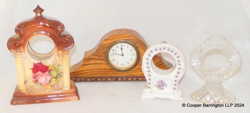 Antique Small Oak Mantle Clock Napoleon Hat Style. Working order. 30 x 14 cm. Also Three Clock Cases 2 x Pottery and 1 x Crystal. (4 items)