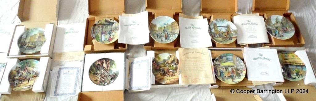 Davenport and Wedgwood Collection Boxed Cabinet Plates fron 1990-1992 to Include: Newspaper Seller. Knife Grinder. Flower Seller. Match Seller. Milkmaid Etc. All with certificates. (10 Items)