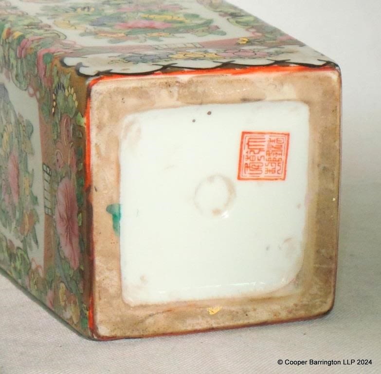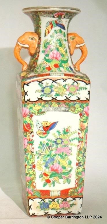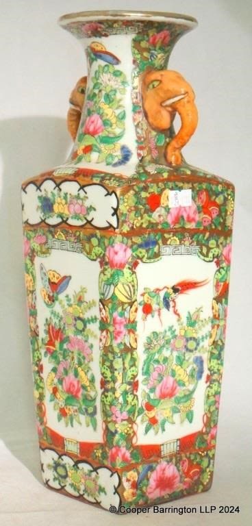 A Large Chinese Famille Rose Square Porcelain Polychrome Painted Vase. Early 20th Century. The flaired neck with elephant masks and tapered square body,folate decorated with butterflies and birds. Apocryphal Qianlong mark to base. Height 36.5 cm