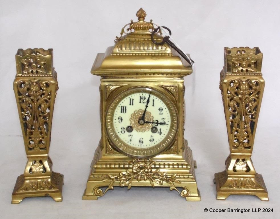 Antique French Louis XV Style Gilt Brass Regulator Mantel Clock Set. The movement being by Japy Freres from the late 1800’s, No.61085. Bell striking on the hour and half hour, on white enamelled Arabic numeral dial. Height 28 cm.