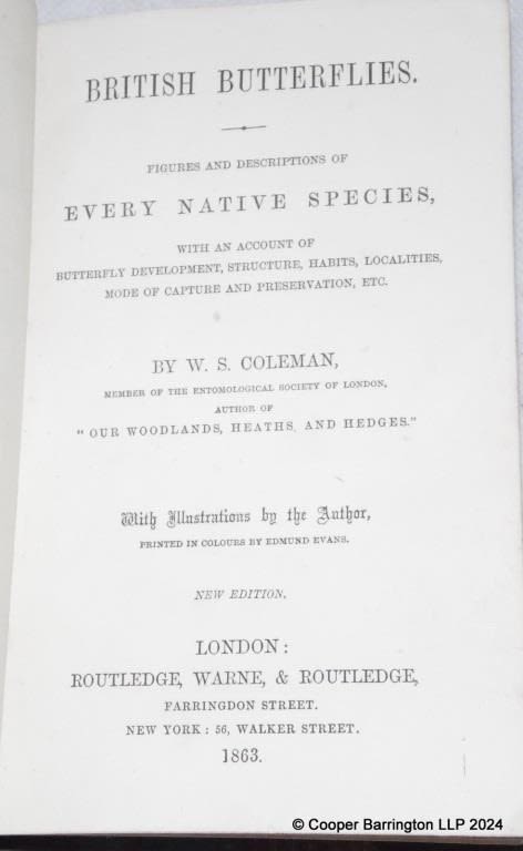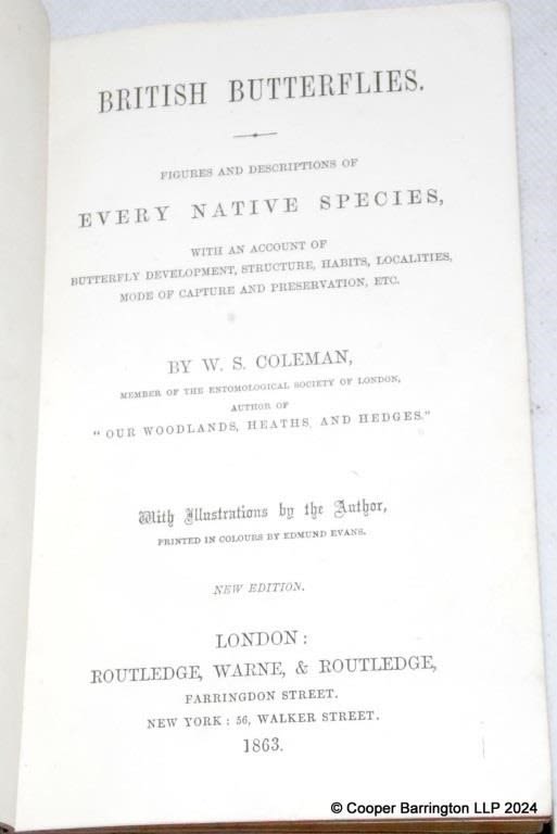 W. S. Coleman British Butterflies. Figures and Descriptions of Every Native Species, with an Account of Butterfly Development, Structure, Habits, Localities, Mode of Capture and Preservation, etc. Illustrated in colour. Published by London: Routledge, Warne, & Routledge 1863. Nice Copy.