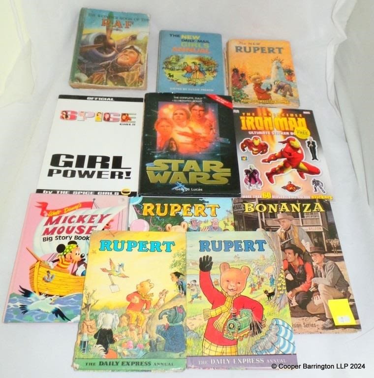Collection of Childrens Books to Include: Virgin Star Wars Complete Illustrated Script. The Invincible Iron Man Sticker Book Complete. Bonanza. Rupert. Mickey Mouse Etc. (11 Items)