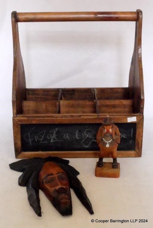 Vintage Treen to Include: Hand Carved Bob Marley Bust. Swiss Hand Carved Figure of a Man. A Blackboard Six Bottle Carrier. (3 Items)