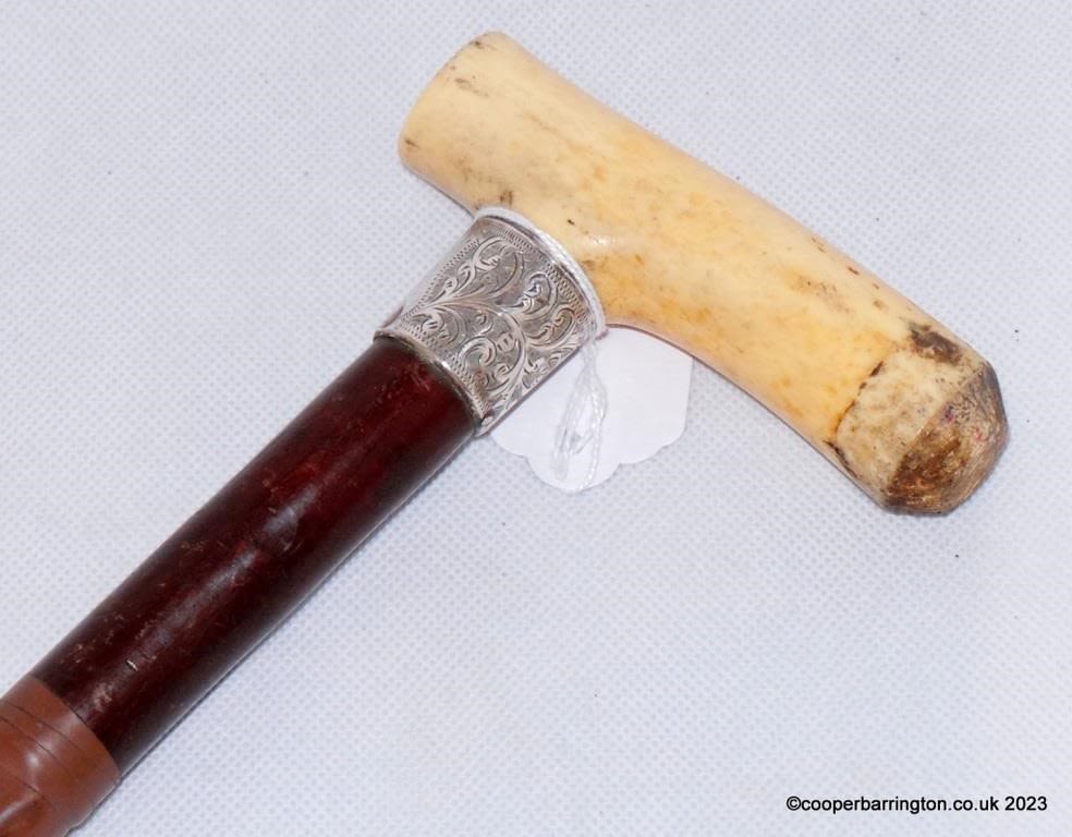 Late Victorian Sterling Silver Mounted Antler Handle Walking Cane by Frederick Coulthurst. Hallmarked Chester 1901. Length 81 cm.