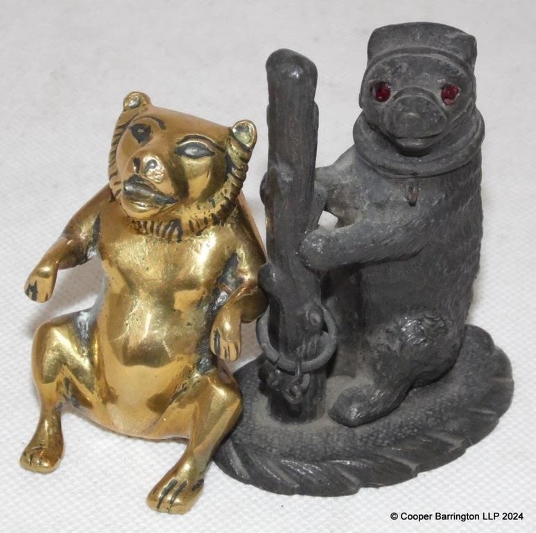 Victorian Bronze Matchholder Bear with Garnet Eyes. Height 8 cm. Also a polished bronze seated bear. (2 items)