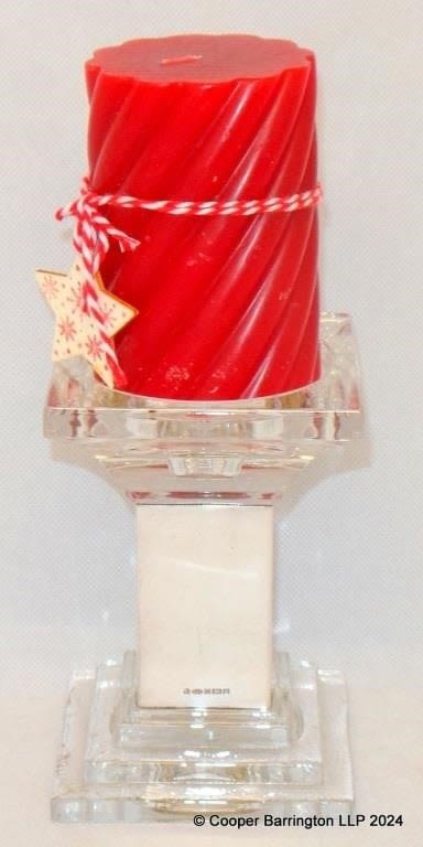 QEll Sterling Silver Mounted Square Crystal Candle Holder/Candle by Carrs Silverware. Hallmarked Sheffield 2004. Can hold 3 sizes of candle. Height 14 cm + Candle.
