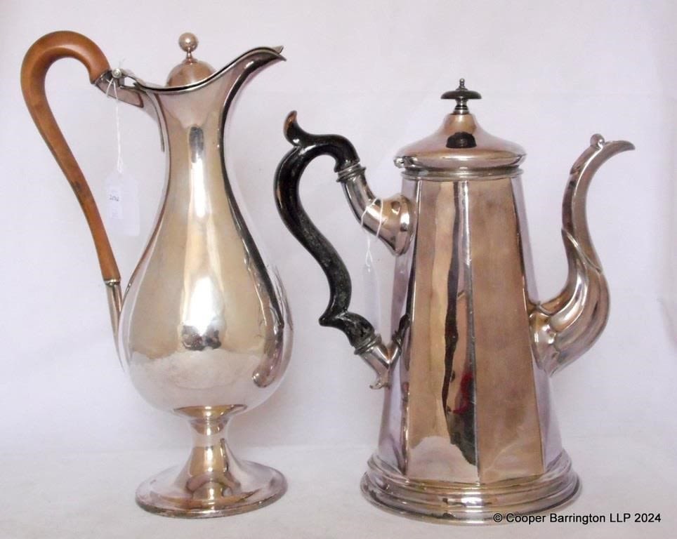 William IV Old Sheffield Plate Coffee Pot. G.Kitching, Sheffield, Circa 1830-37. Marked W Crown R. Height 27.5 cm. Also one other Claret Jug Monogramed RE. Height 31.5 cm (2 Items)