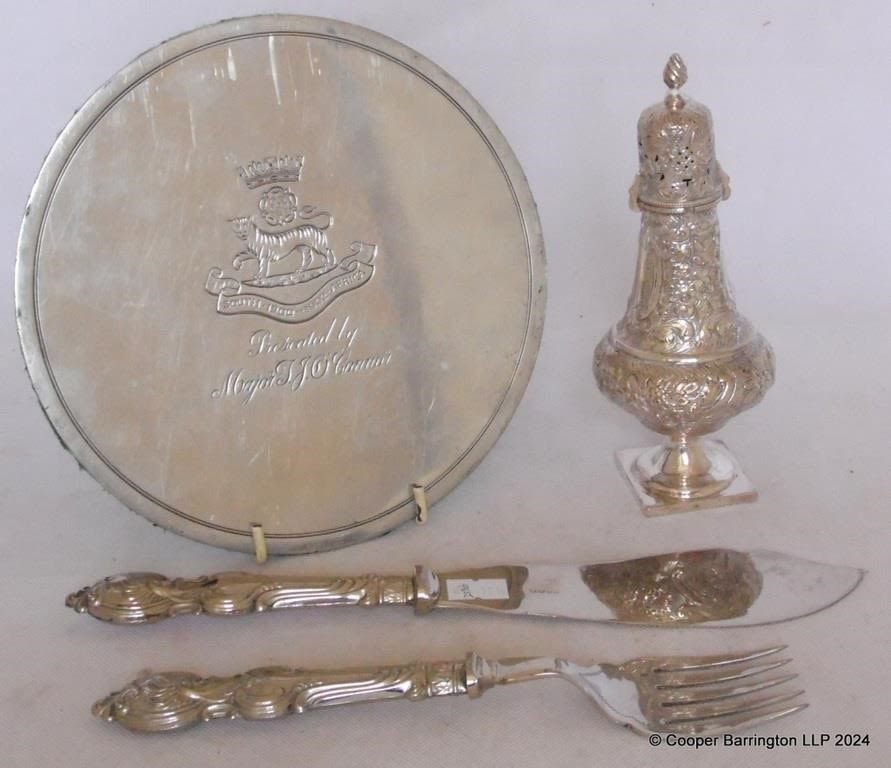 Victorian Silver Plated Coaster South Africa 1900-1902 ‘Presented by Major T J O’Connor. Diameter 20.5 cm. Also a silver metal bayonet top sugar caster (Vacant Cartouch) and a pair of silver plated fish servers. (4 Items)