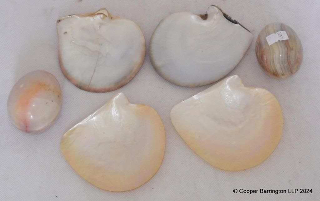 Two Onyx Eggs and Three Polished Oyster Shells. (5 items)