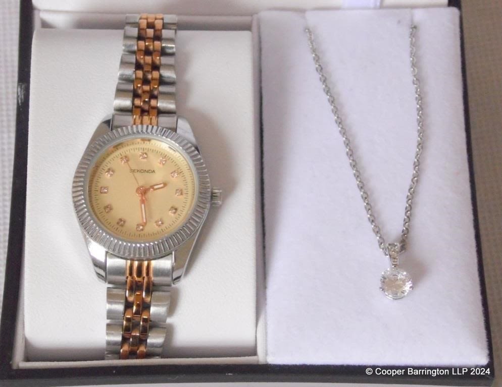 SEKONDA Ladies Bracelet Dress Watch No.2753 and Cubic Zirconia Necklace. Water resistant 30 meters. Stainless Steel back. New Battery. Boxed.