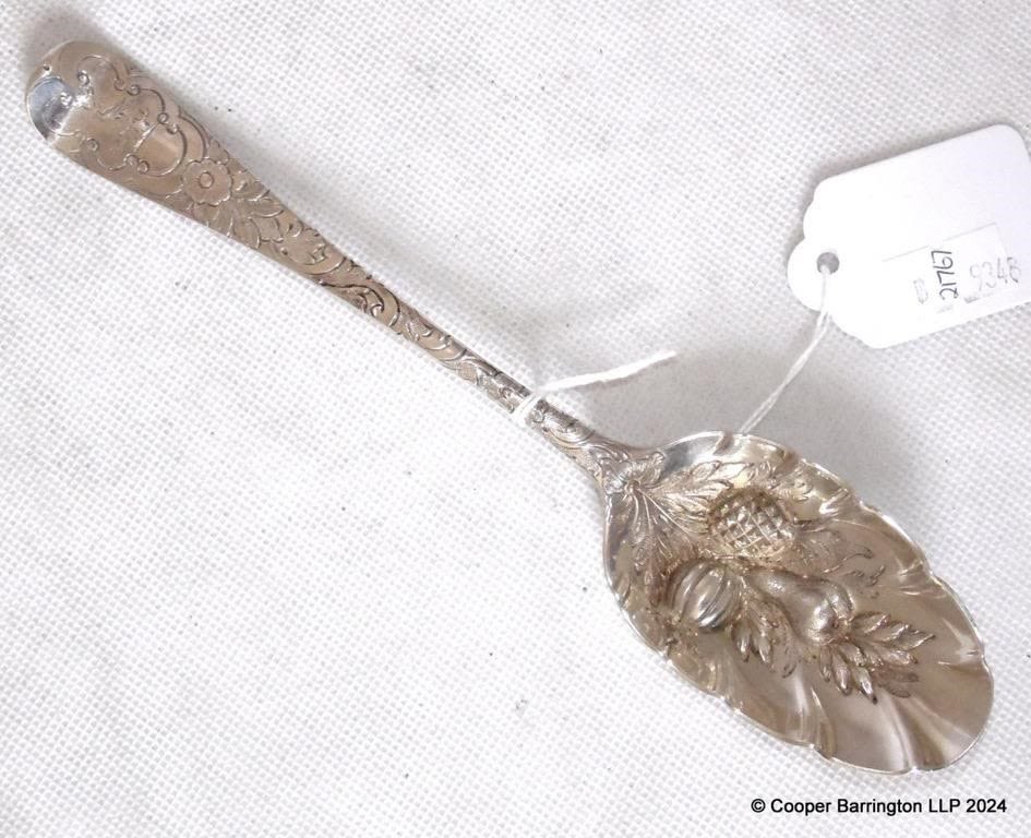 George III Sterling Silver Fruit/Berry Spoon by Ebenezer Coker. Hallmarked London 1780. Armoral and Monogramed W. Length 20 cm. 56.5 gm.