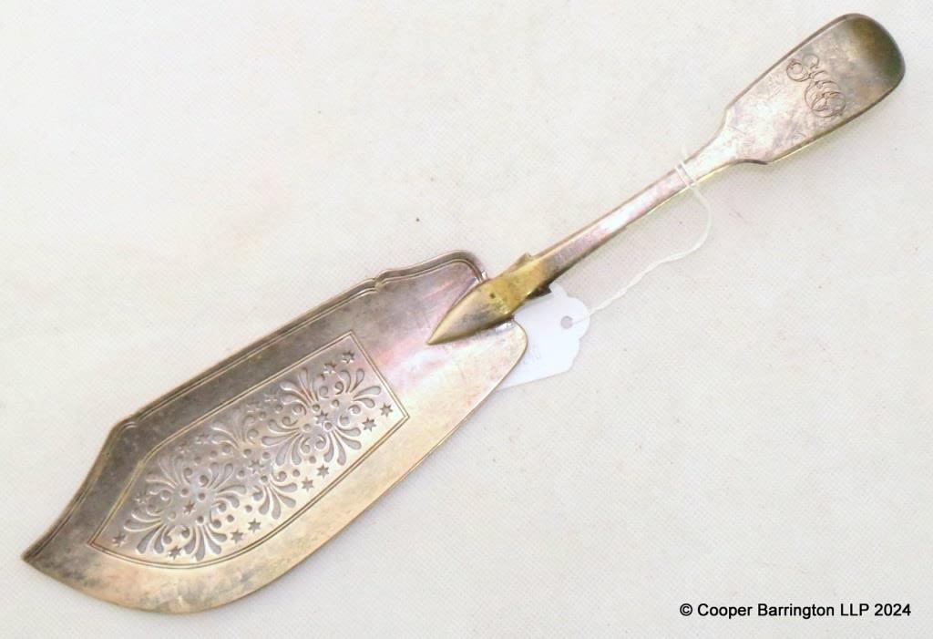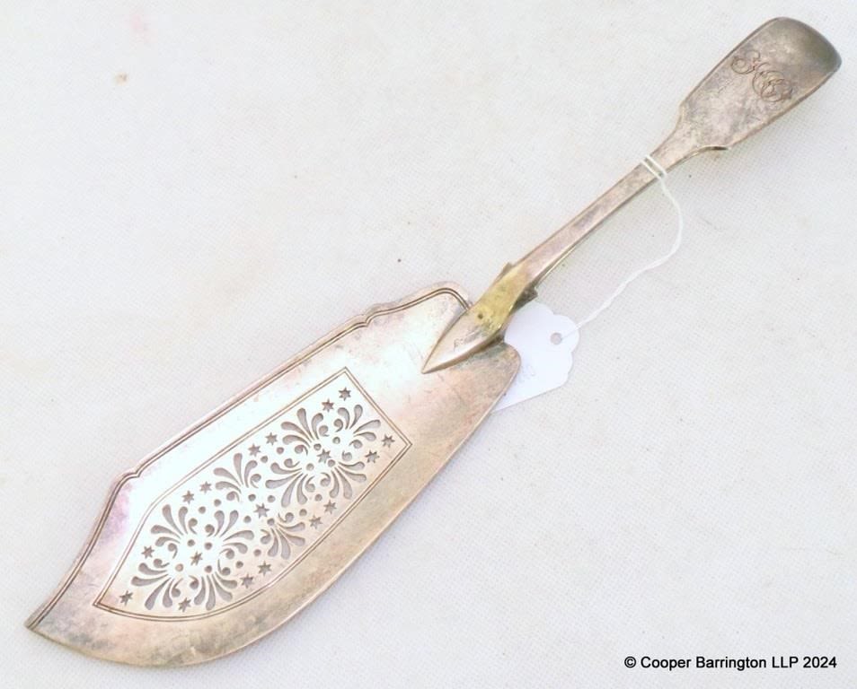 William IV Sterling Silver Pierced Fish Slice by William Brown?. Hallmarked London 1837. Handle Monogrammed HO. 6.1 oz. Length 31.5 cm