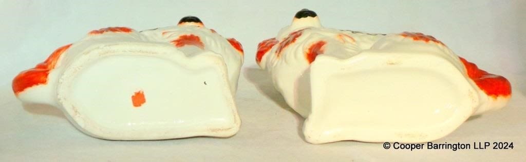 Fine Matched Pair 19th Century English Staffordshire Spaniel Mantle Dogs. Glazed white/russet red with painted faces and wearing lockets. Height 30 cm.
