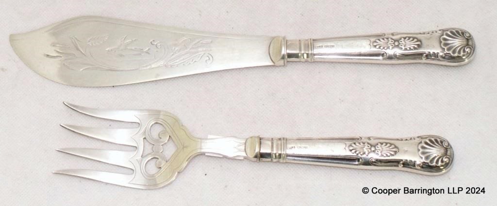 Edwardian Sterling Silver Mounted Kings Pattern Fish Servers by E J Partridge. Hallmarked Sheffield 1905. (2 items)