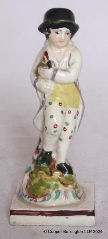 Antique 18th Century Staffordshire Pottery Figure of a Boy with a Chicken. The figure having very fine enamel decoration a great survivor from the late 18th century. Height 10.8 cm.