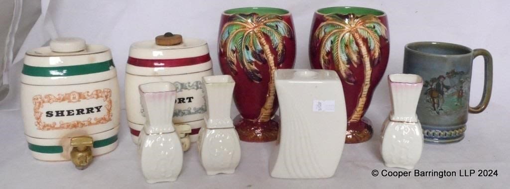 Wade Irish Tankard with Fishermen. Three Belleek Vases Pink/Green. Belleek Candle Holder. A Pair Beswick Palm Tree Vases No 1072. Wade Port/Sherry W A Gilbey Barrels. (9 items)