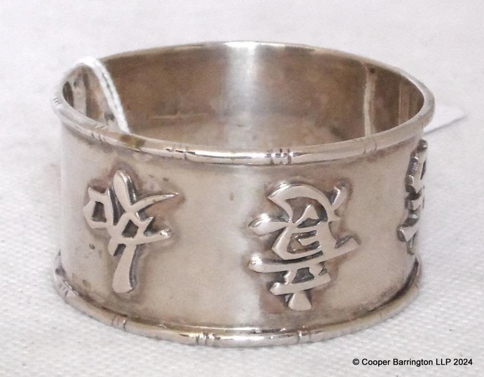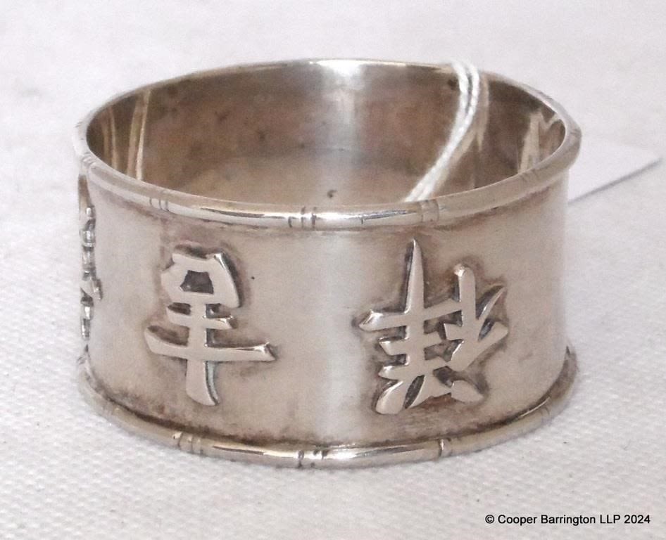 Antique Chinese Sterling Silver Character Design Napkin Ring Signed IW. Circa Early 1900s. 35.1 gm.