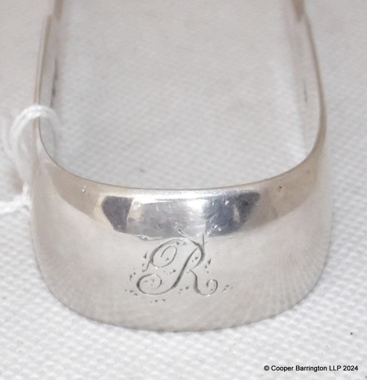 Victorian Sterling Silver Sugar Tongs by William Sobey. Hallmarked Exeter 1846. Monogramed R. 61.2 gm